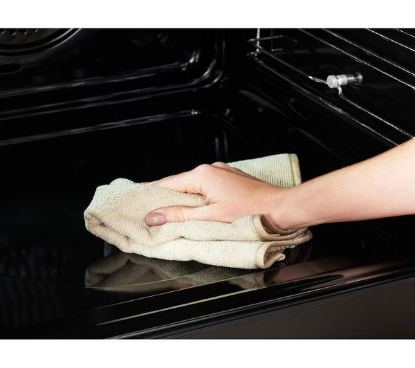 The hob is a smooth ceramic surface that wipes clean easily. The ovens feature an easy-clean enamel coating that helps to absorb grease, allowing for simpler wipe-down cleaning after use.