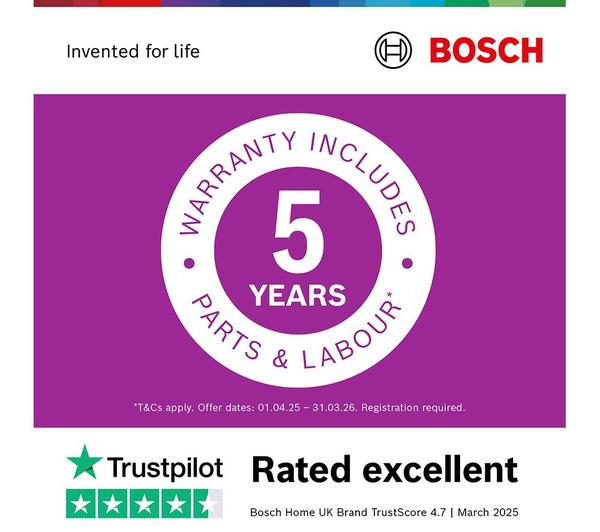 Rest assured with a comprehensive 2-year manufacturer’s warranty covering your BOSCH Series 8 WGB256A2GB washing machine – 10kg, 1400 Spin. This warranty provides protection against manufacturing defects and component failures. Our dedicated customer support team is available to assist with any queries or issues you may encounter, ensuring you get the most out of your appliance.