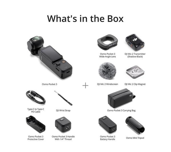 The Creator Combo includes additional accessories designed to enhance your content creation workflow, such as the DJI Mic 2 Transmitter for improved audio, a wide-angle lens attachment for broader shots, and a battery handle for extended shooting times, offering a more complete package for serious creators.