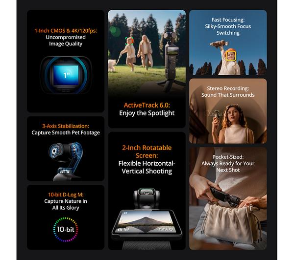 The inclusion of 10-bit D-Log M and HLG colour modes allows for an expanded dynamic range and superior colour grading possibilities, enabling you to achieve truly cinematic visuals. For smooth, dynamic shots, ActiveTrack 6.0 intelligently follows subjects with advanced framing options, making it easier than ever to capture professional-looking action. The intuitive 2-inch full-colour OLED touchscreen rotates to start shooting instantly or provides easy access to settings, making the **DJI Osmo Pocket 3 Creator Combo – Black 4K Action Camera** a joy to use.