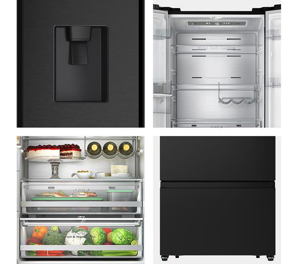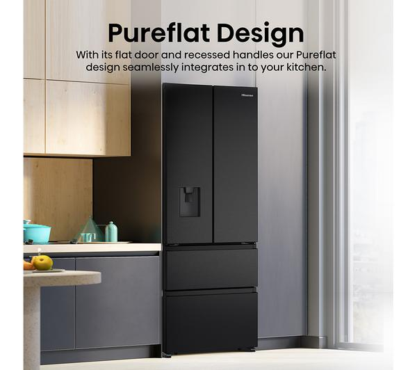 HISENSE PureFlat Slim RF632N4WFE Black Fridge Freezer offers a superior refrigeration experience with its advanced Total No Frost technology and elegant PureFlat design. Keep your groceries perfectly chilled and enjoy the convenience of instant cool water, all within a stylish black finish that complements any kitchen aesthetic.