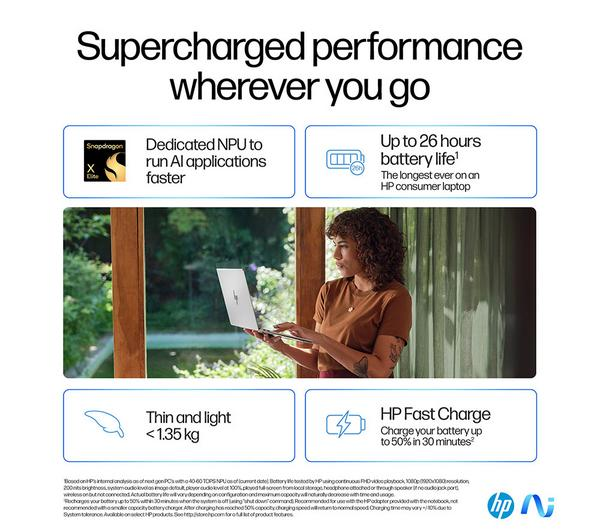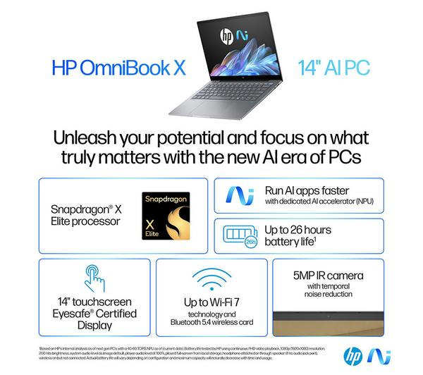- HP OmniBook X 14″ Silver Laptop Snapdragon X Elite 512GB