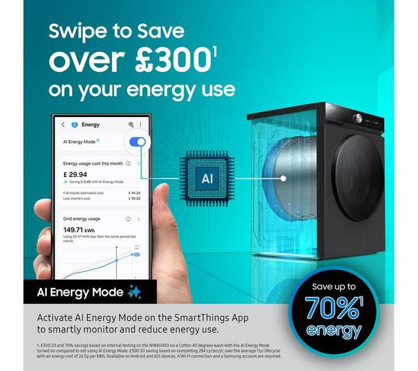 AI Energy mode uses smart technology to learn your usage patterns and optimise the washing cycles accordingly. It can adjust water usage, heating times, and motor speed to reduce overall energy consumption by up to 70% compared to standard cycles.