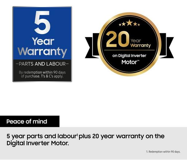 Rest assured with a comprehensive 2-year manufacturer warranty covering parts and labour for your Samsung Series 5 11kg Washer Dryer – AI Energy White. Should you have any questions or require assistance with setup or operation, our dedicated customer support team is readily available to help you get the most out of your appliance.