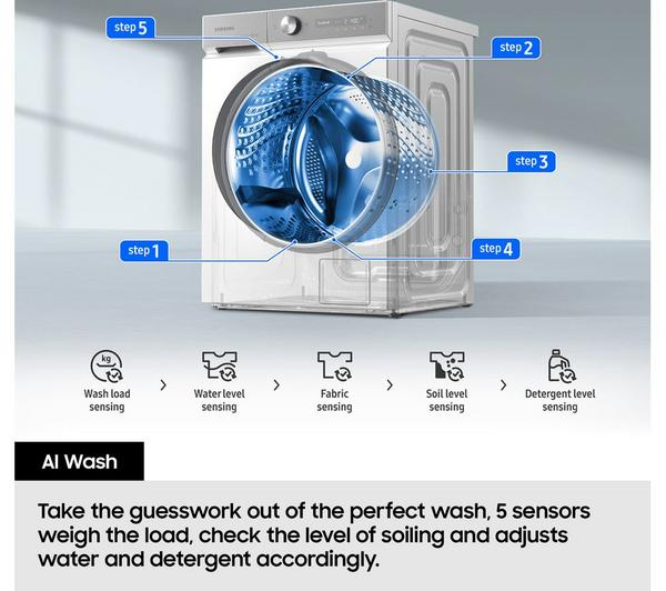 - AI Wash — Utilises sensors to intelligently optimise water, detergent, and rinse times.