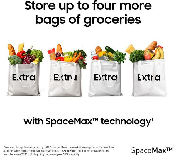 - Enjoy greater storage flexibility thanks to the intelligently designed interior of the Samsung Series 8 SpaceMax Silver Fridge Freezer.
